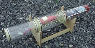 飛行機の墜落事故と同様、潜水艦では沈没の危険が常につきまとう。これは戦艦モデル等の一般的なサーフェスシップと異なるRCサブの欠点であり醍醐味でもあるわけだが、万が一、何かのトラブルでサブが浮上してこなかったとしても、けしてそのまま水中に放置しないこと。 というのも、ニッカド電池や鉛シールドバッテリーには重金属であるカドミウムや鉛が多量に含まれており、長期間水中に放置すれば、これらが水中に流出して走行場の水質汚染を起こすからである。 ファミコンなど、画面の中だけのバーチャル・リアリティとは異なり、RCホビーが最先端の科学技術を駆使して大自然にチャレンジするという性格を持っている限り、我々RCモデラーがそれらを汚すことは決してあってはならない。 さて浮力調整用のバラストタンク・システムは、もっとも皆さんが知りたいメカニズムの一つだろう。 原理は簡単だ。ひっくり返したコップを水面に浮かべたところを想像していただきたい。その上に開閉式の弁を付けたとしよう。ひっくり返したコップを水中に沈めようとしても、コップの中の空気が生み出す浮力のため、沈ませるにはかなりの力がいるはずだ。さて、ここでこの弁を開放するとどうなるかコップの自重で弁から空気が抜け、代わりにコップの下から水が流入してくることは容易に想像できる。結果的に、船底に穴が開いたボートの様に浮力を失って沈んでいくのだ。 ここで再度弁を閉じ、コップ内部にシリコンパイプなどで空気を送り込もう。コップの中に空気がたまり始め、代わりにコップから水が押し出されて浮力が生じる。バラストタンクの構造はまさにこれである。 RCサブに用いられるメイン・バラストタンクの構造を図解してみたが、もちろんタンクそのものは四角形でも良いし、ベニヤ板でハコ組しても構わない。しかし、バラストタンクの形状次第では潜航時の艦の姿勢に大きな影響を与えます。たとえば細長いタンクの場合、潜航時にダウンを打って前傾になった時、タンク内では水が前側に集まり空気は後方に集まります。すると重心は前に、浮力の中心点は後方に移動するため姿勢は大きく崩れて水中に没します。この時、潜舵は殆ど効かず、水深が浅いと水底に激突しますこの事から考えると、重心と浮力中心点の変化が少ない形状は球状と言う事になります。実際には図のようなアクリルレジン製の透明チューブが用いられることが多いようだ。チューブの両端はキャストレジン等で制作しバスコークで塞いだものや、オーリングによる気密を保持するものが多い。この部分にはさほど圧が加わらない為接着強度は大した問題ではない。 チューブの下方には穴が開けられており、水中に向けて大きく開口しているここから水が出入りする。ベント(換気)バルブとしてはチューブ上方に小さな穴が開けられており、スプリングでこの穴にゴム製バルブが押しつけられる。つまり栓である。外側からこの部分をサーボで押せばベント・バルブはメインタンク内の空気をタンク外にベンチレーションするためのものだ。ベント・バルブスプリングには真鍮やゴムバンドなど、水に浸かっても錆びない素材で作られている。 液化ガス用タンクは、銅パイプや真鍮等を高温ロウ付けしたタイプが一般的だ。タンク内のガス注入やブロー・バルブの弁は、自転車や自動車タイヤ用バルブが好適だ。これなら液化ガス内の圧力を保つことのできるし、バルブをサーボで押せば圧力を逃がすこともできるのだ。