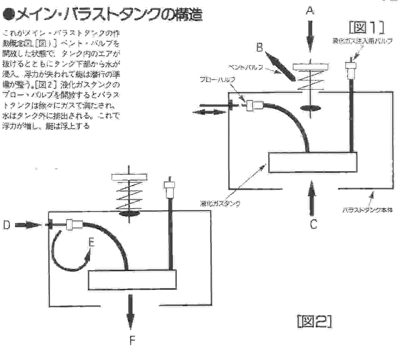 また双方を一度に開ける必要はない。だから1個のサーボでベント・バルブを交互に開閉できるようにしておけばいい。もちろんニュートラルでは両バルブともクローズ状態となる。 液化ガスを圧力源として使うことの利点はもう一つある。 まず液化ガスタンクを満タンにする。その比重は空気よりもずっと大きい。つまり重いのだ。メイン・バラストタンクをベント・オープンしてバラストタンク内に水を満たすが、ここでわずかに艦が沈む程度に浮力バランスを発泡スチロール等で微調整しておく。当然、メインタンクのブローの繰り返しで液化ガスの残りが少なくなってくると、液化ガスタンク内は液化ガスではなく比重の小さな、つまり液化ガスより軽くて浮力を生じる気化ガスで占められるようになってくる。 この状態では潜行すべくメインタンクを水で満たしたとしても、空になりかけの液化ガスタンクそのものが浮力タンクとなり、艦が沈もうとしなくなってくる。つまり、ベント・オープンして潜行させようとしているにもかかわらず沈まないということは、ブロー用のガスタンクが空になりかけているという危険信号にもなるのだ。だから走行前に入念に浮力の微調整を行えば、液化ガスが空になると同時に潜行できないというわけ。 いわば電気を使わない、非常に有効なフェルセーフといえる。