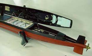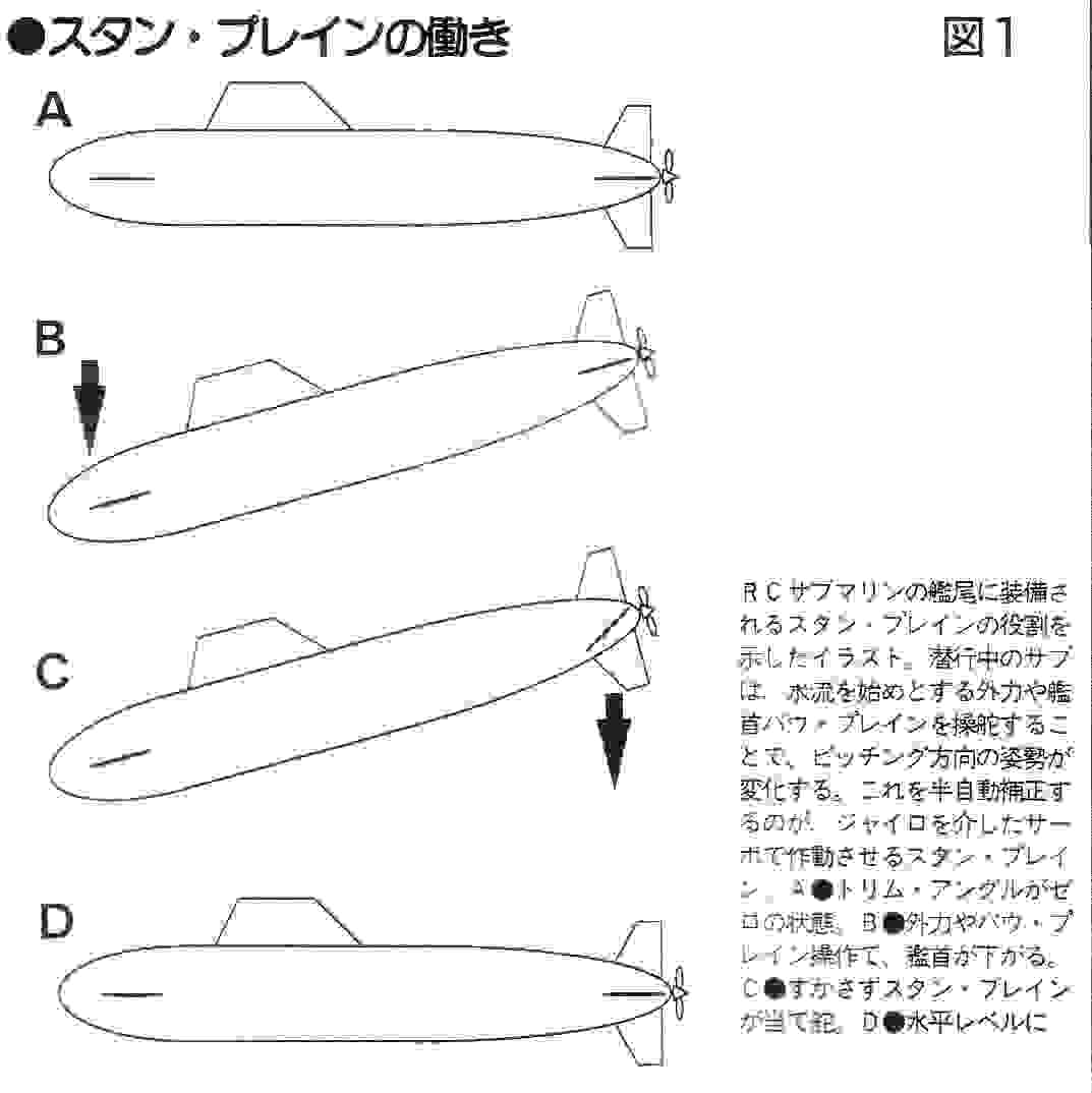 船体(ハル)アメリカで豊富に揃っているグラスファイバー製のハル・キットを用いるのが手っ取り早い。 また、大抵の艦は設計計画書と呼ばれる「モデリング・プラン」も市販されているから、それを購入してシコシコ自作しても良かろう。 さて、フル・アクションのRCサブのコントロールだが、これは@ラダー、Aスピード・コントロール、B艦首バウ・プレイン(深度調整用)、C艦尾スタン・プレイン(ピッチング方向の潜行トリム角度調整用潜舵で、ピッチコントローラーによって半自動制御)、そしてD浮力調整用メイン・バラストタンクのベント及びブロー・バルブ開閉、等で計5系統の動作に各々独立したチャンネルをあてがわなければならない。 実際の潜行手順を解説しよう。 まず、バラストタンク用チャンネルでベント・バルブをオープン。艦外の水をタンク内に満たすと、艦は浮力を失ってウォーターラインは上昇する。そして、ちょうど浮力バランスがゼロになったあたりでベント・バルブを閉じる。 この状態で前進しながら、艦首バウ・プレインを潜行方向に下げると潜り始める。その際、艦のピッチング方向の角度、つまり潜行角度は、艦尾スタン・プレインのチャンネルで操作する潜行トリムの角度によって決定される。例えばトリム・ゼロ(水平状態)にしておけば、バウ・プレインをフル・ダウンしても、ピッチコントロールの働きで艦が水平を保つように艦尾のスタン・プレインに当て舵が打たれ、艦の長軸は水平を保ったまま潜行していくことになる。もちろん、急速潜行したいときはトリム角をダウンs、艦首を下げれば合理的だ。 また深々度からトリムをアツプにして艦首を上げ、さらにメイン・タンクをブローして艦自体の浮力を上昇させながらモーターにフルパワーをかけて急速浮上させれば、実艦の如く水面上にジャンプさせることも可能だ。またモーター停止中にメイン・バラストタンクで浮力を調節すれば、停止した状態で浮いたり沈んだり水中停止も可能である。へりのホバリングほどではないにせよ、巧みに艦をバランスさせながらコントロールする感覚は、それに近いといっていいだろう。 実艦では艦長の命令の下、個別のクルーが艦を操って潜行・浮上を行うのに対して、RCサブではたった一人で操艦してしまおうというのだから、例え航行速度がスケールスピードでゆっくりだとしても、なかなか忙しい。