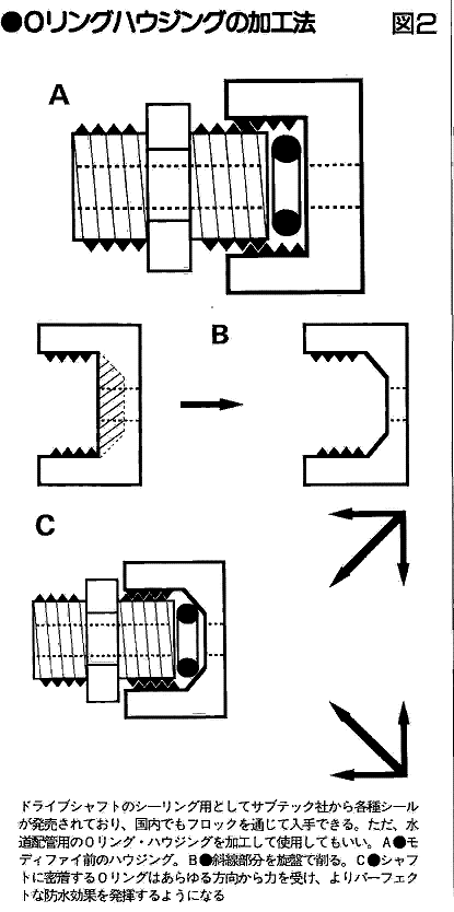 RCサブの製作で、バラスト・タンクと並んで難しいとされるのが、スクリュー・シャフト取り出しの部の防水方法。これにはラバー製のオーリングを用いた方法が広く用いられてきた。 代表的な商品はインチ・サイズであるが、サブテック社からRCサブマリンモデル専用に製作されたオーリング式防水パーツが発売されており、これを用いるのが手っ取り早いと思われる。またサブモデラーの多くは、ホームセンターや東急ハンズ等で入手可能な汎用オーリングの中からスクリュウー・シャフトにマッチしそうなサイズを探し、これをモディファイして上手く使っている。もちろん価格的にもリーズナブルである。 その加工方法を図示しておこう。 図のように内側を斜めに加工したオーリング・ハウジングキャップで締め込むことでスクリュー・シャフト側にオーリングが押しつけられる形となり、防水がおこなわれる。これに摩擦を軽減できる程度のグリスを併用すれば、オーリングに欠け等の劣化がなければ、防水そのものはオーリングだけで何ら問題ない。 このへんは操舵系出力軸の防水にも応用できる。工作用に旋盤が必要になるのが難点といえば難点だ。 ちなみに、このハウジングをモディファイせずにそのまま用いると、オーリングはシャフト内径位まで大きくなってしまう、下手をするとオーリング内径がスクリュー・シャフト外径より大きくなってしまい、ガバガバの状態で浸水が止まらない事態を招くことにもなりかねない。十分な注意が必要だろう。 しかしながら、Oリングの締加減で消費電流が倍以上ちがいます。 そこで登場するのが神戸サブマリンクラブのオリジナルシールなるものです。 最低寸法はφ4mmからしかないのですが、ほとんど点接触で外から圧力がかかる程 シールが締ます。詳しくは入会されたメンバーにサポートしております。 余談だが、世界的なレベルで見ると様々な法的規制のおかげか、日本国内では企業間の価格競争にさらされていない商品が多く、私達はまだまだ高い買い物をさせられているケースが多い。そこで私達は海外との取引もおこなっているので、個人輸入のお手伝いも可能です。