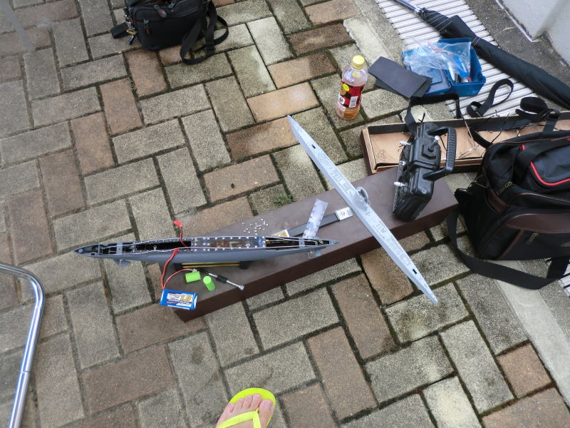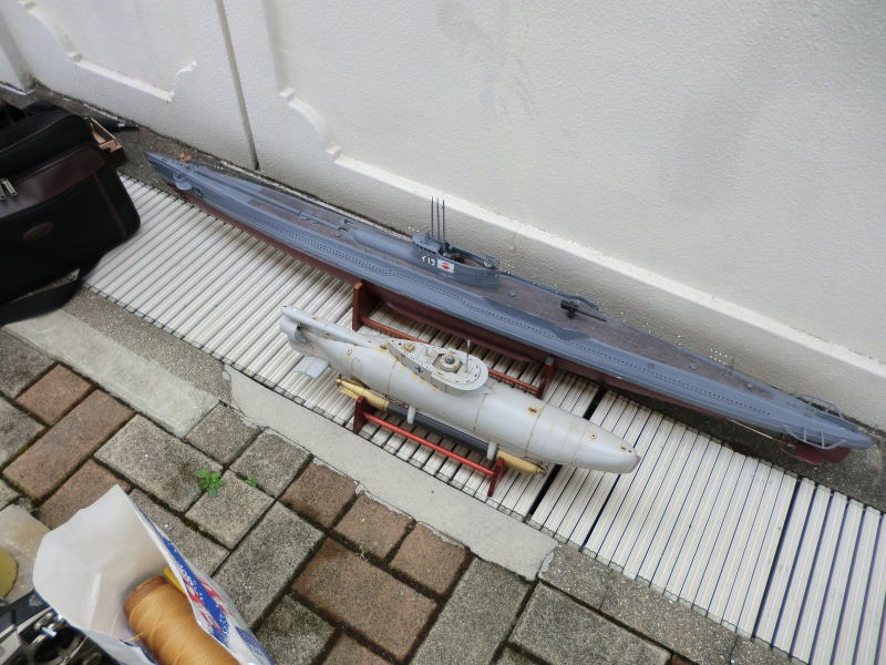 | ▲山下氏 UⅡA。小さく狭い船体をセミドライハルでラジコン化 | |